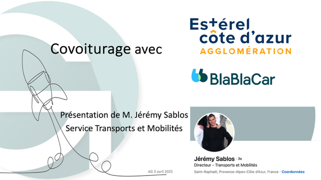 Pendant notre assemblée générale d’avril nous avons pu recevoir M. Jérémy Sablos directeur des transports d’Estérel Côte d’Azur Agglomération pour nous présenter l’offre “BlablaCar Daily” qui facilite et soutient finacièrement le covoiturage.